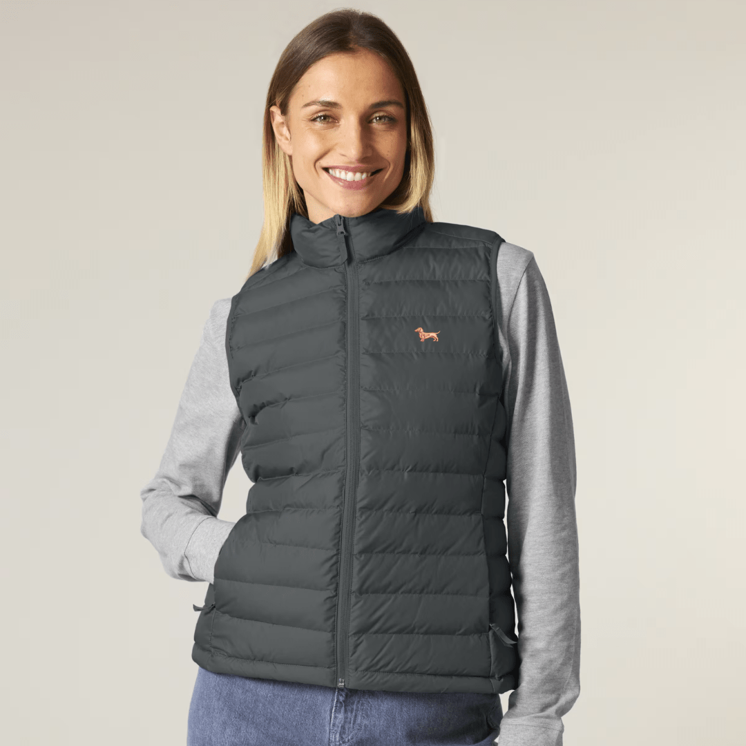 Unsere leichte Dackel-Daunen Weste vereint modernes Design, Funktionalität und Nachhaltigkeit – perfekt für Spaziergänge mit deinem Vierbeiner oder für deinen urbanen Alltag.
