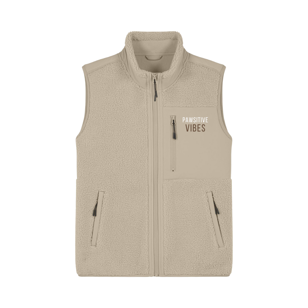 Warm, lässig und nachhaltig – unsere ärmellose Sherpa-Weste ist dein perfekter Begleiter für Spaziergänge, Training oder entspannte Stunden draußen. Mit ihrem minimalistischen Design und dem PAWSITIVE VIBES Logo verbindet sie Funktionalität mit Lifestyle.